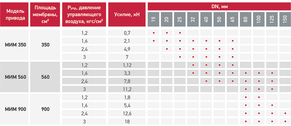 Ниже указаны характеристики пневматических мембранных приводов собственного производства (МИМ 350, МИМ 560, МИМ 900). Возможна комплектация изделий другими моделями приводов по запросу заказчика (Polna, Смартгир и др.)